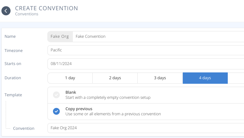 When creating a new convention under your organisation you can now choose between a blank setup or to copy a previous convention.